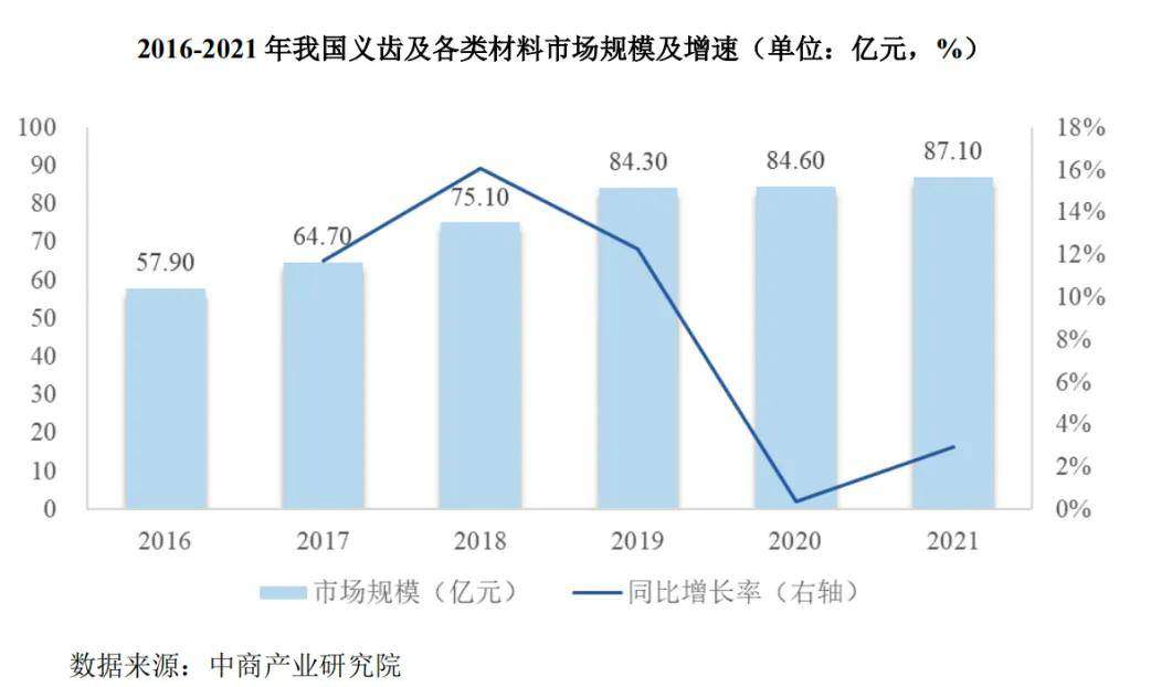 2、毛利率低於同行公司,種植牙集採或影響盈利近年來,受益於人們經濟生活、文化消費水平的提高以及對口腔健康意識的增強,我國義齒及各類材料市場規模呈現不斷增長的趨勢。根據中商產業研究院預測,2021年,我國義齒及義齒材料市場規模達到87.1億元。