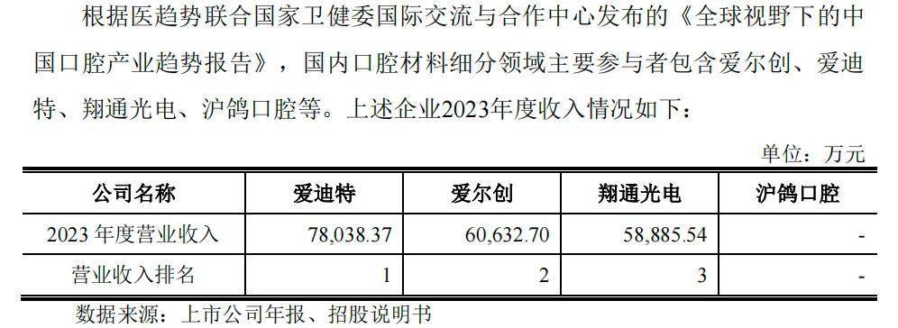 在國內口腔材料細分領域主要參與者中,2023年,愛迪特以7.8億元的營業收入排在第一位。