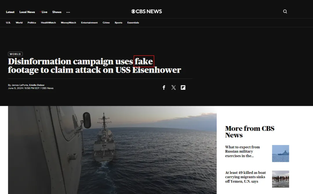 5月31日,胡塞武裝發言人聲稱對美軍的艾森豪威爾航空母艦發起了攻擊,這次行動的目的是回應美軍和英軍對也門發起的空襲行動,胡塞武裝出動了導彈部隊和海軍部隊,使用“有翼導彈”和彈道導彈,目標被準確命中。此舉彷彿點燃了媒體界的火藥桶,各大媒體、網絡平台都在報道、傳播此事。