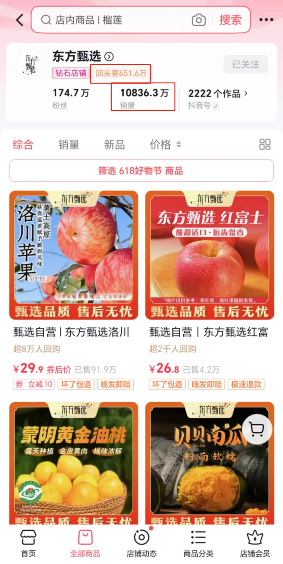 從最初的生鮮、零食,擴展到運動、速凍麪點、海鮮水產等領域,據東方甄選於今年披露的自營品兩週年成績單,截至今年4月,僅抖音渠道,東方甄選店鋪的累計銷量為9887.7萬,接近1億單大關,東方甄選自營產品數量已超過400款,今年以來,自營產品品類保持高速增長。
