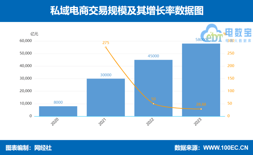 2023年私域電商交易規模達到5.8萬億元,同比增長28.88%。2020-2022年,國內私域電商市場交易規模分別為:8000億、3萬億、4.5萬億。私域電商活躍度持續增長,市場規模不斷擴大。此外,隨着企業對私域流量的重視和運營能力的提升,越來越多的用户被吸引到私域電商平台中。