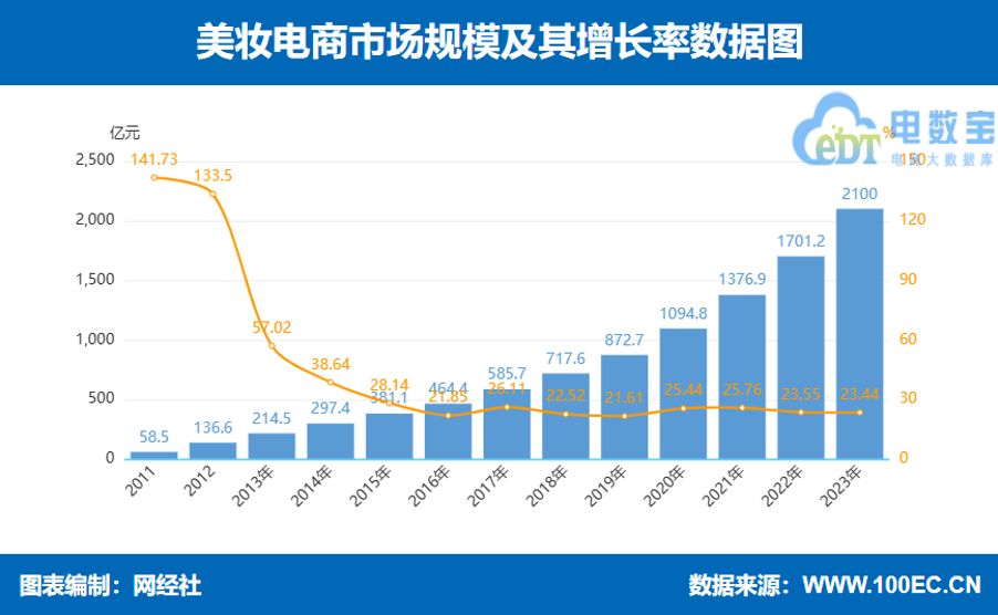 2023年我國美妝電商市場規模為2100億元,同比增長23.44%。