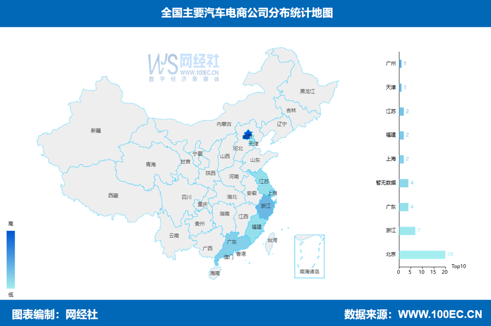據網經社企業庫顯示,全國主要汽車電商平台企業分佈為:北京(20家)、浙江(7家)、廣東(5家)、上海、福建、江蘇均2家,(3家)、天津(1家)。