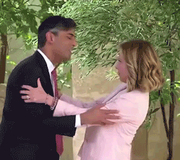 不過,今年峯會也並非一無是處,雖然在實質性議題和成果上乏善可陳,但與會人員場外互動卻成了唯一亮點。47歲的意大利女總理焦爾吉婭·梅洛尼與各國領導人的場外互動尤為引人注目,堪比印度寶萊塢的愛情大片。她與烏克蘭總統澤連斯基、美國總統拜登等人的緊緊擁抱和親密交談成為了媒體關注的焦點。特別值得一提的,是她跟現年44歲的英國首相里希·蘇納克見面,兩人目無旁人,在大庭廣眾之下親密互動,又是擁抱又是親吻又是調笑,把在場的其他人當做空氣,被記者調侃為“比戀人還要甜蜜”。