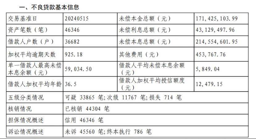 四川錦程消金2024年第1期個貸不良資產包,未償本息合計約2.15億元,借款人户數36682,加權平均預期天數925.18,資產筆數46346,且全部為信用擔保(無抵押),每一項都極具挑戰。