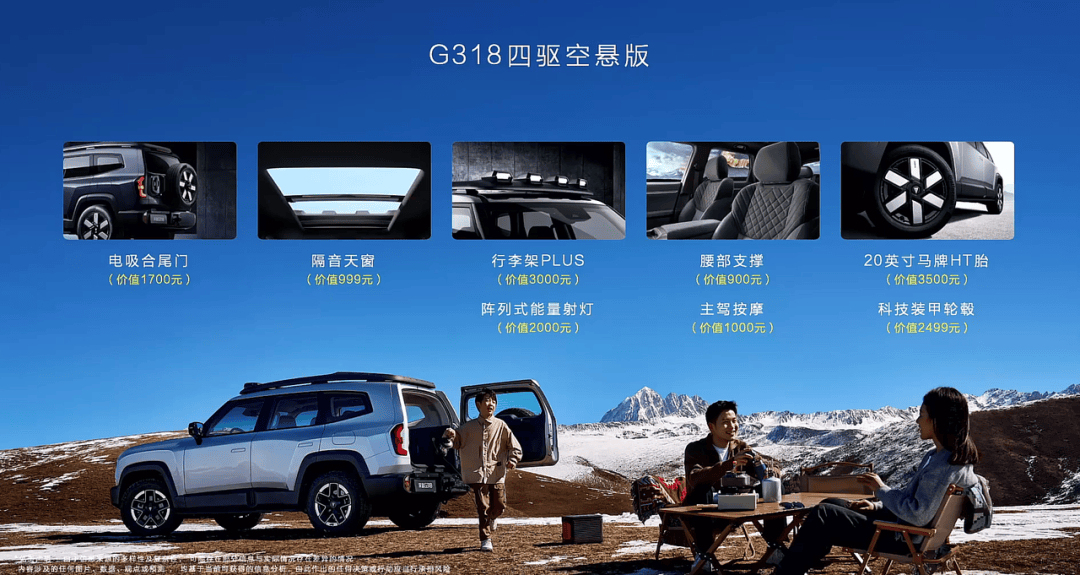 總的來説, G318 還是一分錢一分貨,在優秀的底盤基礎上,內飾和配置作出了妥協,但是它豐富的户外功能又很好的彌補了這點。