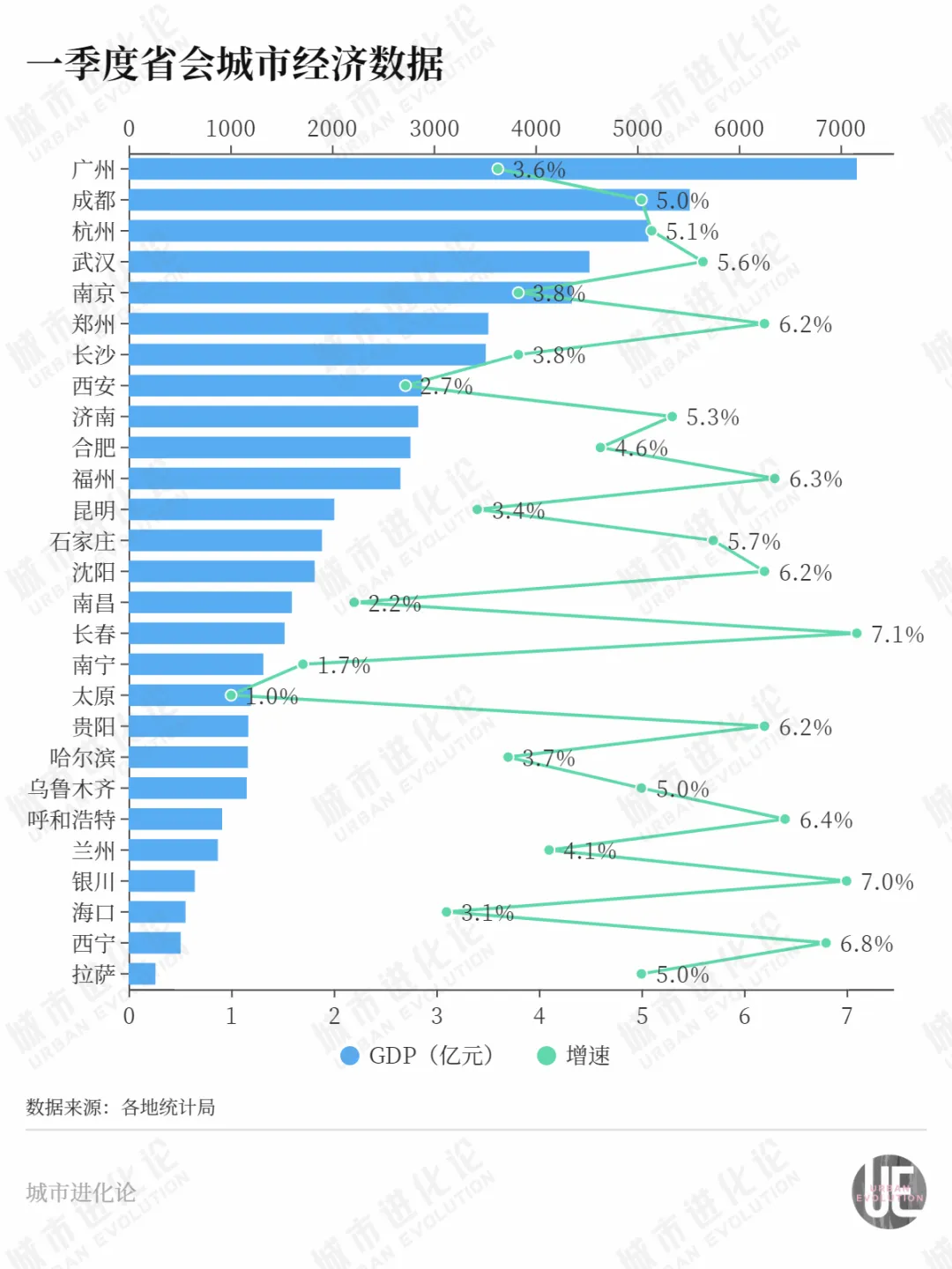 拉到全國27個省會城市中,一季度跑贏(或等於)全國經濟增速(5.3%)的只有11個。反之,共有16個省會城市增速跑輸全國大盤,17城增速低於全省平均水平,佔比均在半數以上。