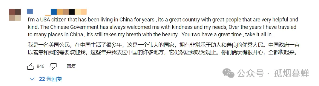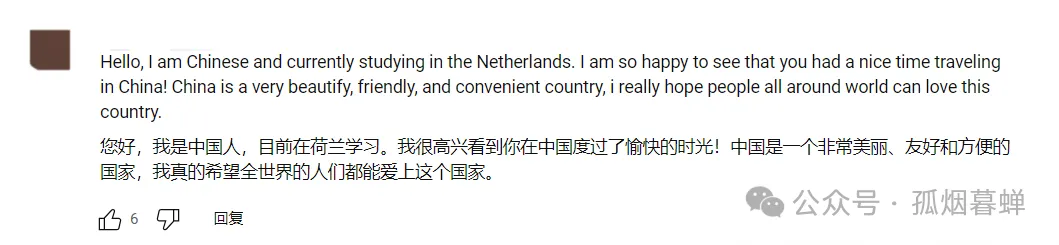 “有趣的是,我今天一直在看各種有關的中國旅遊視頻,因為我很想去中國。我現在正躺在牀上翻來覆去地睡不着覺,拿着我的手機狂甩大拇指,根本停不下來,然後我就刷到了你們倆!真是太驚喜了!希望你們這一天過得愉快。我也想通過你們的視頻學點東西。祝你們玩得開心!保重!”
