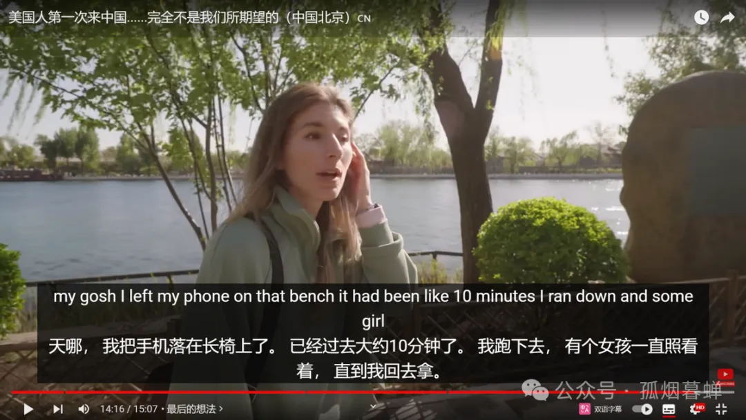 山姆和湯姆傳到YouTube上的這段視頻大約有15分鐘長,他們把他們對自己北京首日遊的個人感想放在了最後兩分鐘來講。而他們在這兩分鐘時間裏基本上就只説了一件事情,那就是我前面提到的:山姆因為大馬哈把手機落在了長椅上了,過去十分鐘了才想起來匆忙回去取,結果發現原地有幾個中國女孩一直在幫她看着,等着失主回來認領。