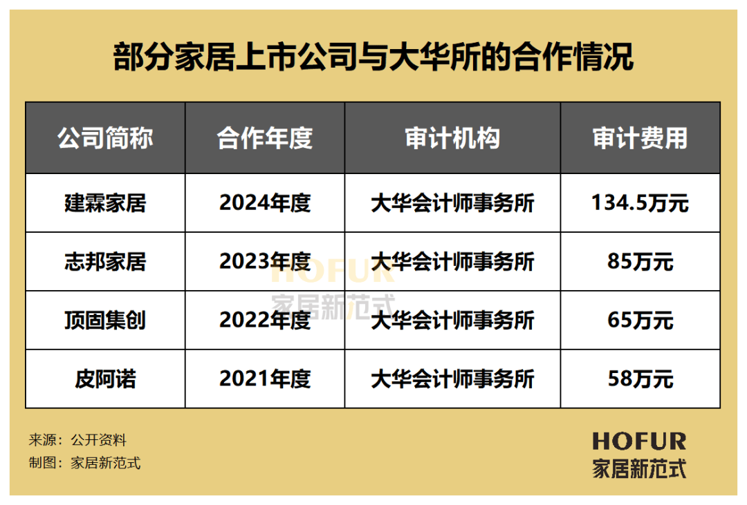 事實上,6月初家居新範式曾在《普華永道遭解約背後,30+上市家居公司的審計機構偏好及費用排行一覽》一文中,盤點過30家左右家居企業的審計合作機構,發現除了上述的志邦家居,去年皮阿諾、頂固集創、建霖家居的會計合作機構都是大華所。