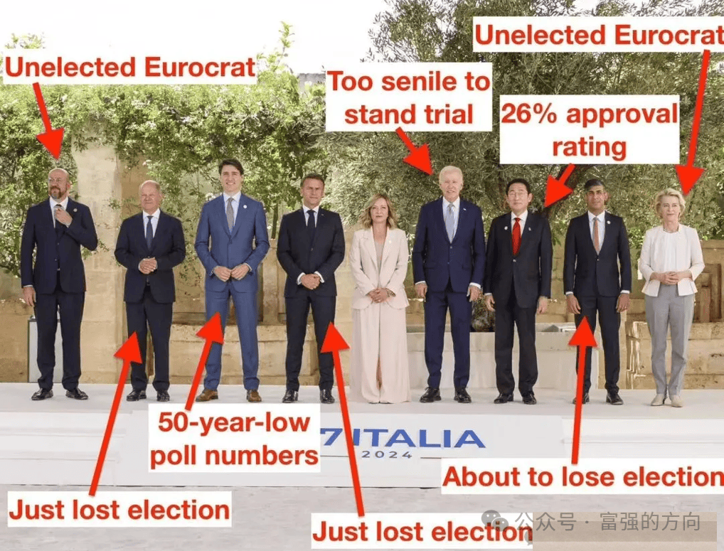 G7領導人合影,文字標註非常有趣,讓我想起拜登訪問法國的場景_風聞