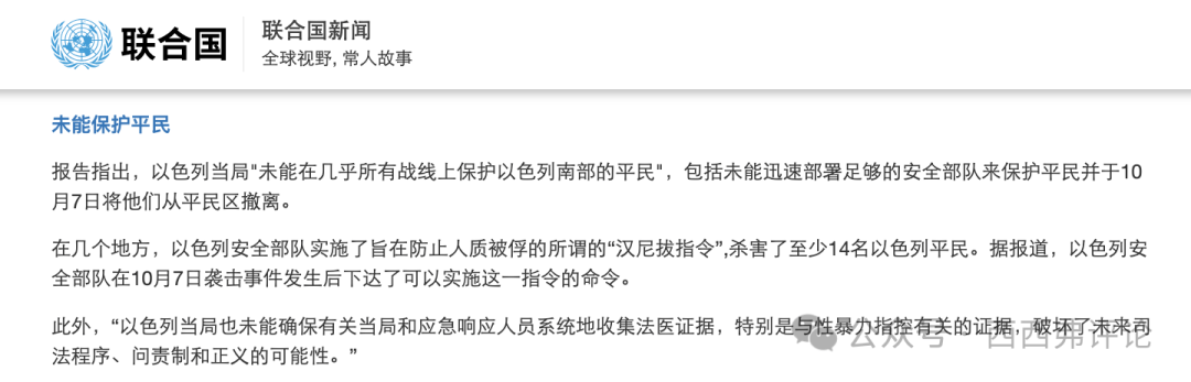 這位博主並不知道,根據聯合國的調查報告,以色列安全部隊實施了旨在防止人質被俘的所謂的“漢尼拔指令”,殺害了至少14名以色列平民。漢尼拔指令的核心是寧可讓士兵死,也不能讓士兵被俘。跟進這個指令以色列軍隊將向運送以色列國防軍戰俘的敵軍開火,即使可能導致戰俘死亡。這次哈以衝突,以色列把這個指令應用到了被哈馬斯俘虜的人質身上。