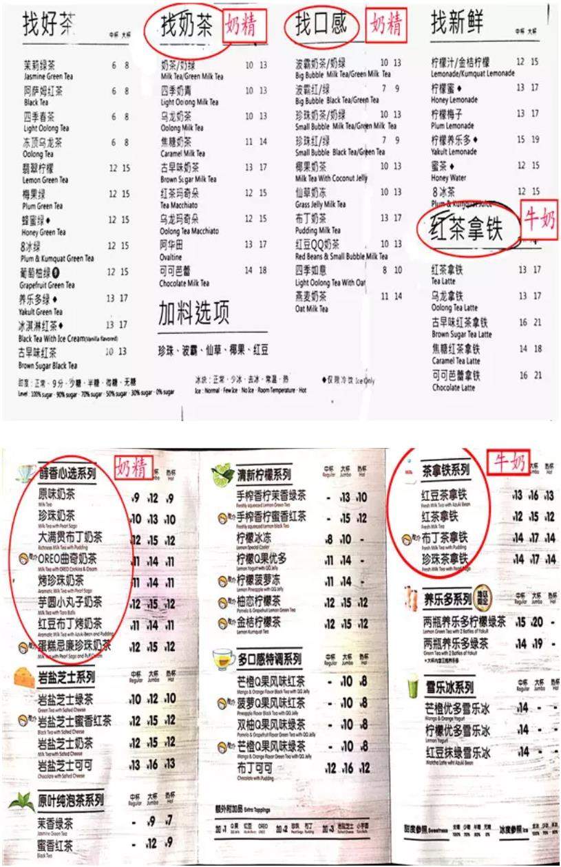 奶茶菜單上鮮奶系列和拿鐵系列可選。那些突出口感、醇香的要避開。
