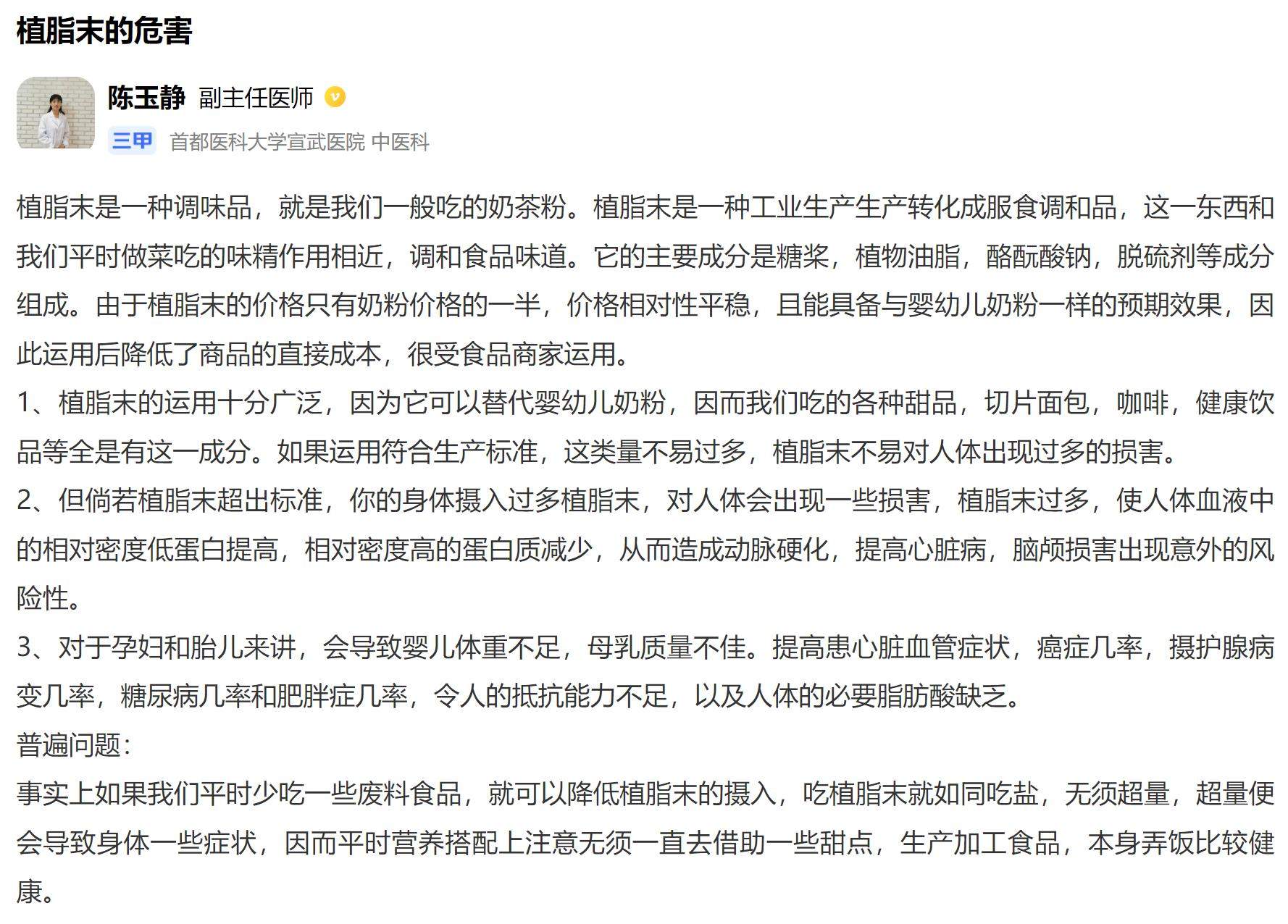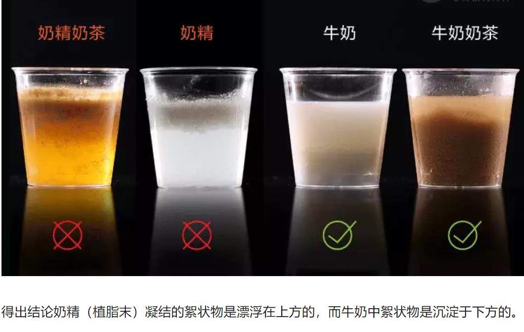 查到“植脂末”,即奶精這假貨,兑水後就是常見的普通奶茶、蛋糕等。
