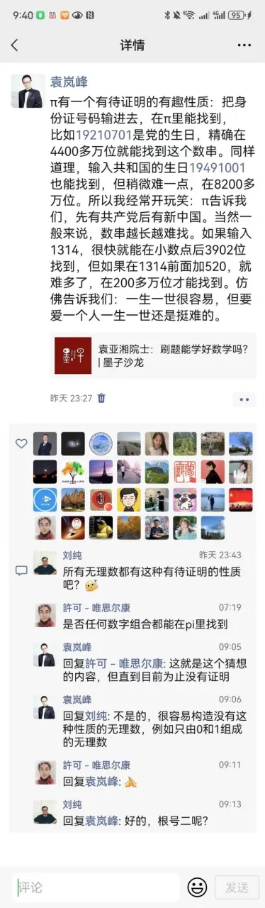 緊接着,袁亞湘又説了圓周率的一個性質。你如果明白他説的是啥,你的知識水平就超過了99.999%的人。他的原文是: