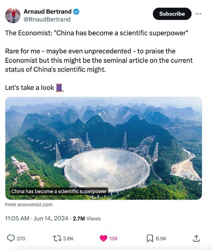 “如果美國在戰爭和文化戰爭上浪費更少的錢,也許他們會處於更好的位置”、“曾幾何時,蘇聯也是科技超級大國”、“投資於優質的STEM教育是一個國家可以做出的最大生產力投資之一。西方的挑戰在於,回報通常比政府任期更遠。”、“這裏缺少一個關鍵點 - 誰贏得了 AGI 比賽,誰就贏得了一切。”、“如果我有孩子,如果有機會,中文將成為他們的第二語言。”、“《經濟學人》的記者怎麼了?那句每次都會出現的“但代價是什麼?”去哪裏了?”