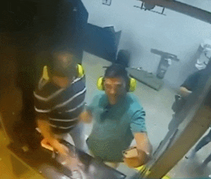 ▲新手在靶場自拍時將槍口對準朋友,安全員都嚇尿了