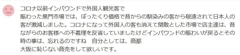 在新冠疫情之前,因為大批湧入的外國遊客,黑門市場一度十分繁華。但是,由於那裏的商家經常殺熟、宰客,哄抬物價,導致日本本地顧客逐漸減少。新冠疫情爆發後,外國遊客也消失了,使這個市場變得越發冷清。在這段蕭條時期,商家們開始反省以前對待老主顧的過分行為。可惜,隨着入境遊客重新湧入,他們開始好了傷疤忘了疼,重蹈覆轍。作為一個大阪人,我希望這裏的商家能夠誠實經營,不給大阪的商業文化抹黑。