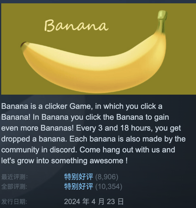 它在 steam 商店頁面簡介中的第一句,已經概括了它所有的玩法: Banana is a clicker Game 。Clicker Game ,即點擊遊戲,進去後點就完事了。