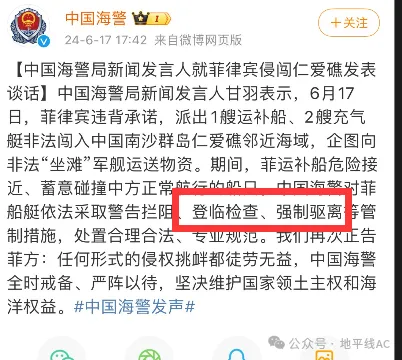 果不其然,就在今天,中國海警船就開始了行動。中方首次以登臨檢查的方式對付菲律賓艦船,並將其強制驅離。