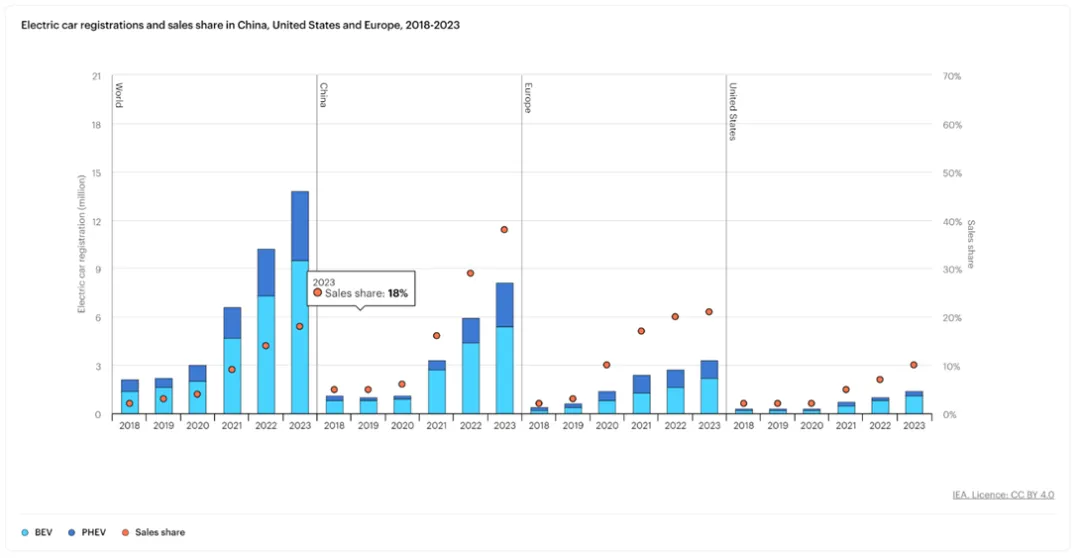 2023 年電車銷量接近 1400 萬輛,其中 95% 在中國、歐洲和美國。
