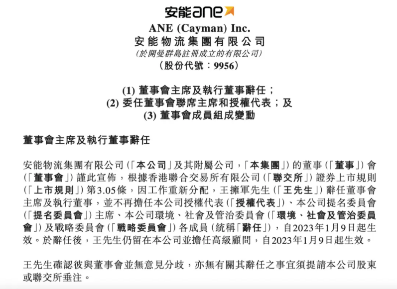 2023年1月,安能物流發佈公告稱,因工作重新分配,王擁軍辭任董事會主席及執行董事,且不再擔任公司授權代表、公司提名委員會主席、公司環境、社會及管治委員會及戰略委員會各成員。