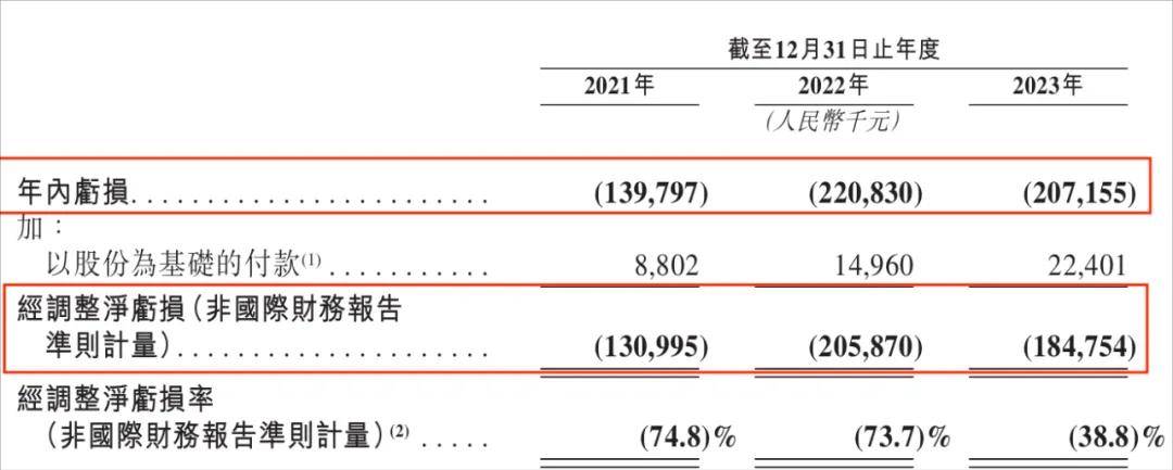 2021年至2023年,其淨利潤虧損1.40億元、2.21億元、2.07億元;經調整淨利潤虧損1.31億元、2.06億元、1.85億元。短短三年時間,公司累計淨利潤虧損超5億元。
