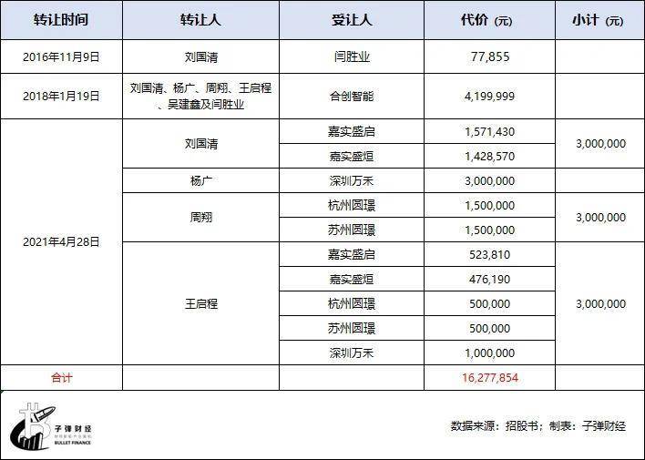 2016年11月,劉國清向公司前董事閆勝業轉讓77855元的註冊資本,套現77855元;2018年1月,劉國清、楊廣、周翔、王啓程、吳建鑫及閆勝業向合創智能轉讓部分股份,再次套現約420萬元。