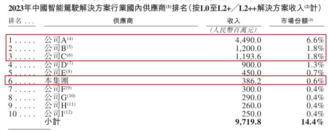 按L0至L2+╱L2++解決方案收入計,2023年,佑駕創新實現收入3.86億元,在中國智能駕駛解決方案供應商中位列第6,市佔率僅有0.6%。