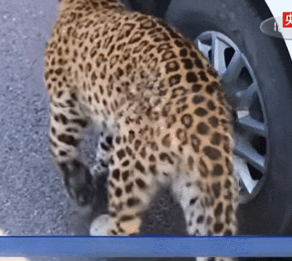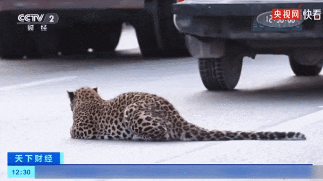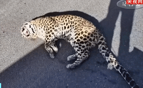 這隻豹子顯然是被車撞了,而且傷得不輕,視頻前段它只能躺在地上連起身都費勁,勉強站起來後也能看出了它連路都走不穩。但是從它站起來走的那兩步倒是看不出來它的腿有明顯的受傷,網上的新聞也是説左後腿右後腿受傷的都有,不過豹子的左側毛髮表面和身後的路面上都有血跡,我推測它受了內傷的可能性很大。