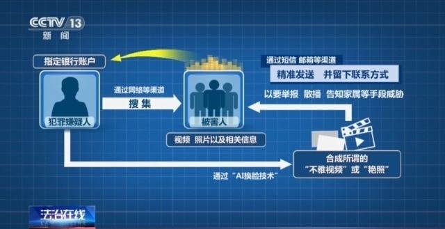 警方介紹,在這些案件當中,犯罪嫌疑人先是通過網絡等渠道,蒐集被害人的視頻、照片以及相關信息。再通過AI換臉技術PS合成所謂的“不雅視頻”或“豔照”,然後通過短信、郵箱等渠道,精準發送給選定的對象並留下聯繫方式,最後以要舉報、散播、告知家屬等手段威脅選定的對象,要求被害人將錢匯到他們指定的銀行賬户。