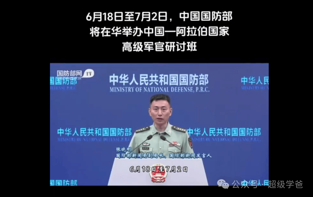 6月14日,國防部新聞發言人張曉剛大校擲地有聲地宣佈,6月18日~7月2日,中國國防部將舉辦中國-阿拉伯國家高級軍官研討班。這個研討班將由解放軍國防大學承辦。