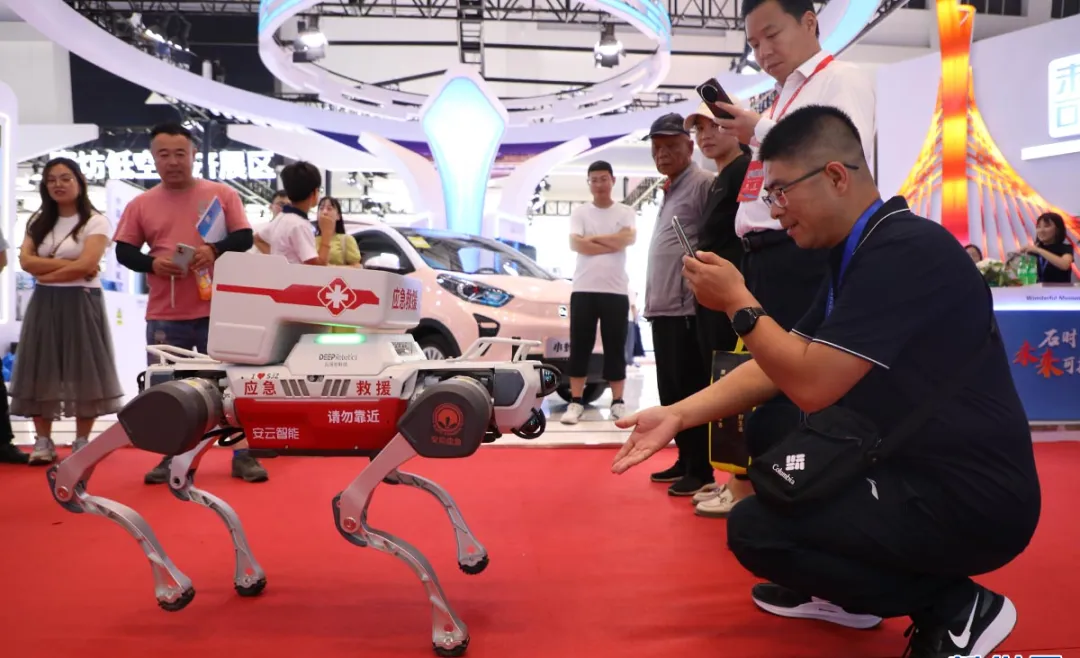 6月16日,廊坊國際經濟貿易洽談會上,參觀者與四足行業應用機器人互動(圖源:新華社)