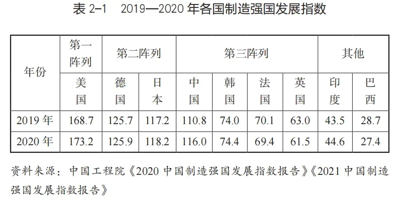 在過去數十年間,中國被視為世界的製造業基地,“世界工廠”“中國製造”甚至“中國創造”一度成為眾所周知的詞語。從絕對值來看,中國製造業在2021年的增加值在全球佔比高達29.79%,接近美國、日本、德國、韓國、印度五國的總和(30.82%)。然而,與世界一流製造業強國相比,中國製造業體現為大而不強。