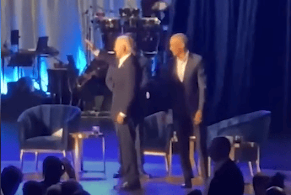 就在幾天前,民主黨主辦了全國募款大會,主持人就是好萊塢的著名男星喬治·克魯尼,而且還請來了嘉賓奧巴馬。就在台上,很明顯看到拜登一下子僵住了,與現場熱鬧的氣氛完全脱節,有好幾個手機拍下這樣的鏡頭,奧巴馬還是很機智的,趕緊上去解圍,慢慢地牽着他,轉身走下台去,從他的腳步還是可以看到他的步履是僵硬的,如同機器人般,還沒有回過神來。