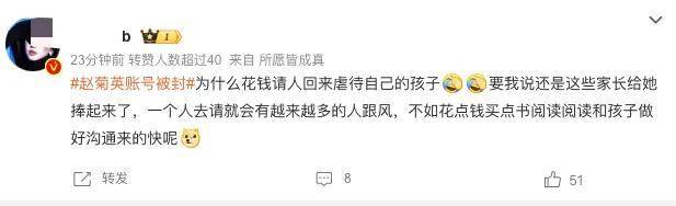 今天,**小柴上網衝浪的時候,刷到了一條大快人心的新聞,**就是被無數家長追捧、自詡為家庭教育專家的趙菊英在社交媒體上的賬號終於被封了,很快,關於趙菊英賬號被封的話題就衝上了熱搜。