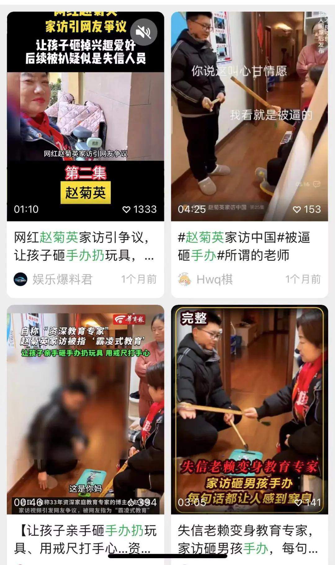 到了趙菊英這裏,其自然沒有躲過賽博判官們的審判,比如趙菊英入網沒多久,很快就翻車了,翻車的點來自於其拍攝的家訪視頻中,教育模式的爭議。