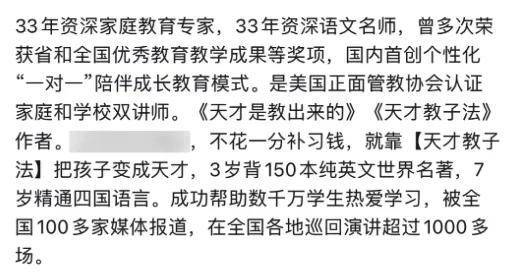 除此之外,她還稱自己是美國正面管教協會認證的家庭和學校雙講師,出版過「天才是教育出來的」「天才教育法」等著作。