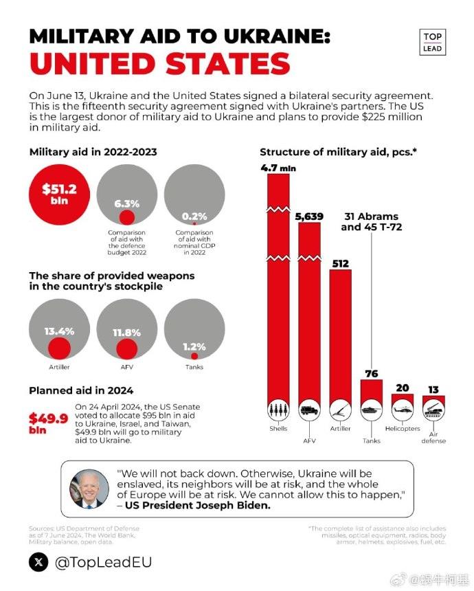 美國對烏提供和計劃的軍事援助總額為1000億美元。