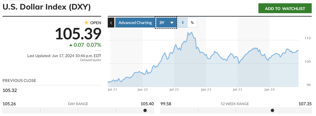 當我寫下這個標題的時候,衡量美元對一籃子貨幣匯率水平的“美元指數”為105.39,處在2021年6月以來的中間偏高的位置。