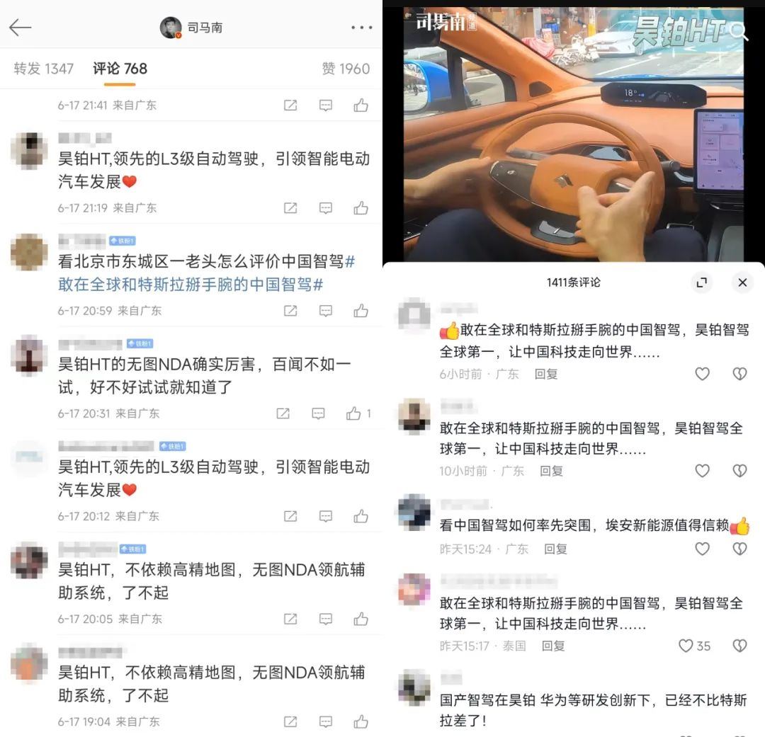 6月17日,在抖音和微博(09898.HK)分別擁有3647.9萬和322.8萬粉絲的大V司馬南,發佈了題為“面臨美國技術封鎖打壓,是看中國智駕如何率先突圍”的視頻,為廣汽(601238.SH,02238.HK)埃安旗下新昊鉑HT造勢。該視頻24小時內在微博播放量2.4萬,抖音收穫2.3萬贊,以平台普遍3%的點贊率測算,該視頻播放量約80萬。