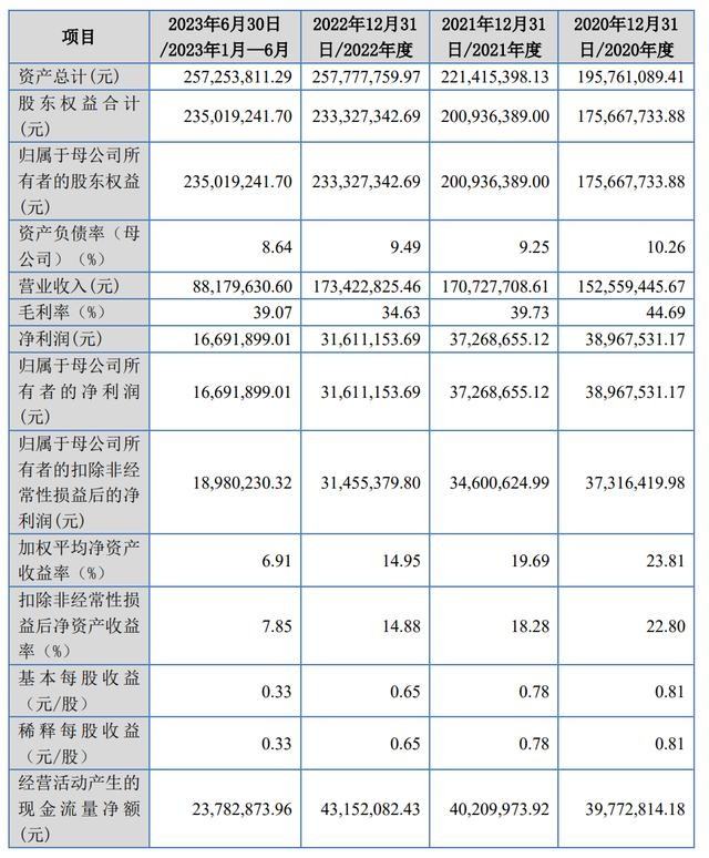 在此背景下,温多利也走在增長軌道上。招股書顯示,2020-2023年1-6月(以下簡稱“報告期”),温多利營業收入分別為1.53億元、1.71億元、1.73億元、8817.96萬元。另外,根據公司業績報告,2023年,温多利實現營收1.85億元,同比增長6.91%,淨利潤3804.51萬元,同比增長20.35%。