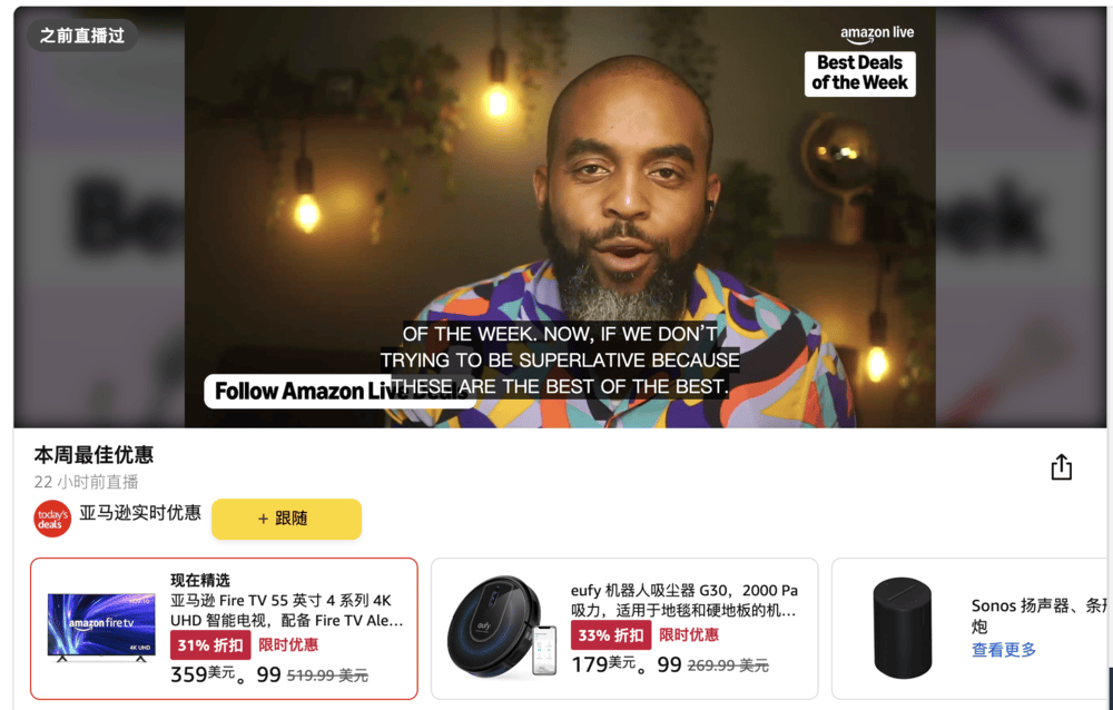 消費者觀看直播,除了聽詳細講解外,最看重的是價格,國內直播中常聽到“今天給到的價格是…”、“買一送二”等,國外直播間也會在直播時給出價格上的優惠,在“亞馬遜實施優惠”的賬號直播裏,很多折扣就標識在下方的購物鏈接中。