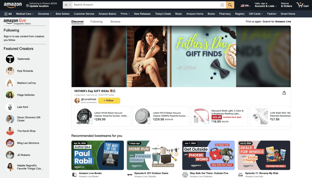 打開Amazon Live的主頁,可以看到精選創作者、推薦直播、即將開始的直播以及當下流行趨勢等分類,與國內相同的是,服裝、美容、遊戲等始終是最受歡迎的類目,隨着父親節的到來,還有很多直播間掛上了適合父親的好物。