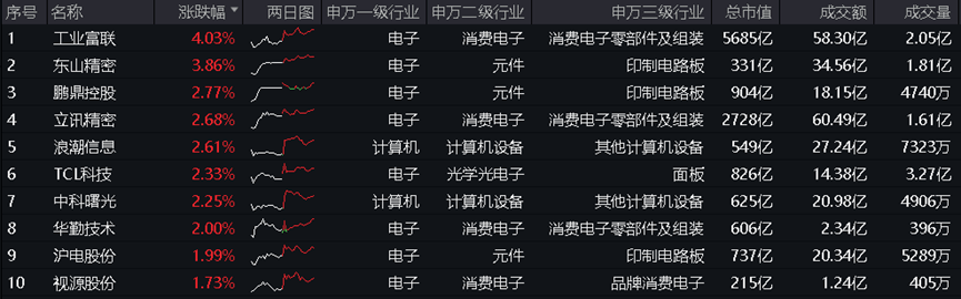 今日,蘋果產業鏈領漲消費電子板塊,車路雲概念延續強勢。AI服務器龍頭工業富聯領漲超4%,近4日累漲17.44%;PCB(印製電路板)概念股東山精密、鵬鼎控股漲逾2%,繼續活躍;“果鏈”龍頭立訊精密、權重股浪潮信息、中科曙光等個股亦表現亮眼。