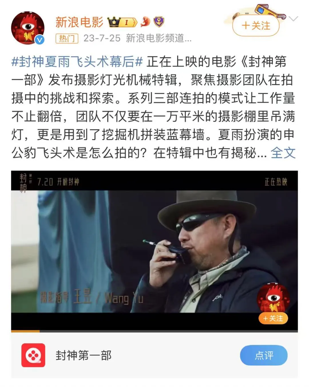 除了深度參與電影的營銷,觀眾對創作的幕後故事也展現出較強的興趣,這也能解釋,為什麼現在編劇、製片人越來越喜歡在微博活躍,跟粉絲、用户進行溝通。此前,@新浪電影就曾帶領大家揭秘《封神第一部》裏申公豹飛頭術的拍攝過程,相關話題被網友頂上熱搜。這既讓觀眾感受到了幕後付出的不易,也為這系列作品的持續發酵提供了素材。