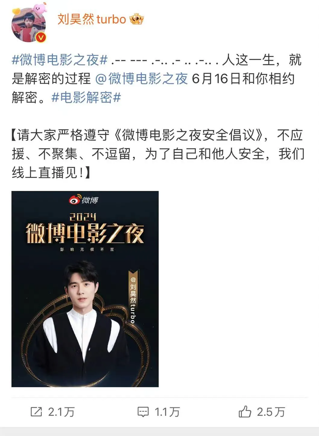 其中,《解密》改編自麥家同名小説,陳思誠導演,克里斯托弗·麥克布萊德編劇,劉昊然、吳彥祖和陳道明主演,這陣容、這配置本就不缺看點。而微博電影之夜開始前,劉昊然就在微博發出一串摩斯密碼,更是燃起廣大網友的互動熱情。該片如此完成了第一輪話題傳播,曝光量也隨之上漲。