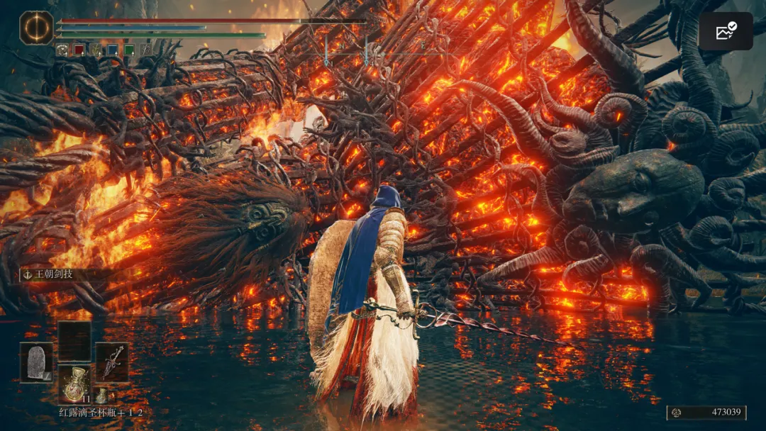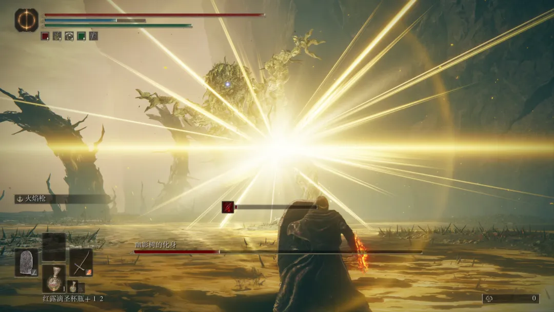 此外,地圖上到處遊蕩的火焰巨人,在DLC中的定位類似於本篇中“黃金樹的化身”,擊敗它後可以獲得新的靈藥露滴。DLC初期,解決它的方式只有“修腳”,直到其失衡倒地才能解決。但後續,遊戲會指引你找到一種更簡單便捷的方式將其擊敗。