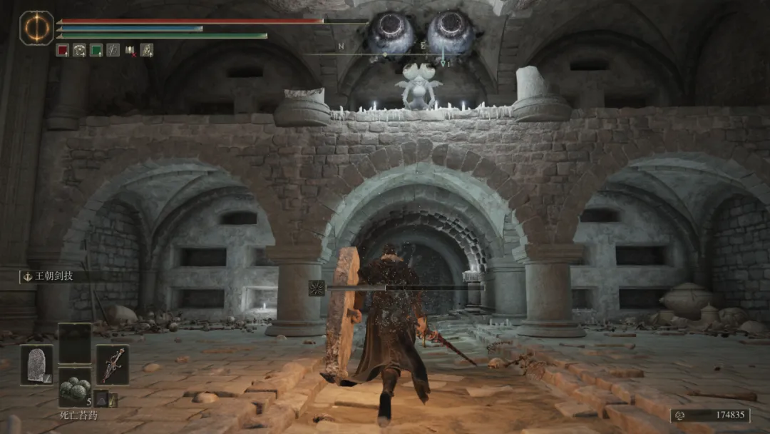 最後要提到的,是DLC中的“地牢”與“墓地”的設計更新。《黃金樹之影》的監牢加入了全新的要素,那就是“壺”。在這裏,玩家會遇到由各種各樣的“壺”構成的迷宮,也能看到這些壺中的實際內容物到底為何。**而地下墓地的設計仍然出彩,**每個不同的墓地,都圍繞着完全不同的主題搭建。例如在全黑的地圖中摸黑探索,尋找燈光的開關;或是立於必經之路的不斷注視玩家的咒死之眼,需要玩家東躲西藏避開注視避免驟死。