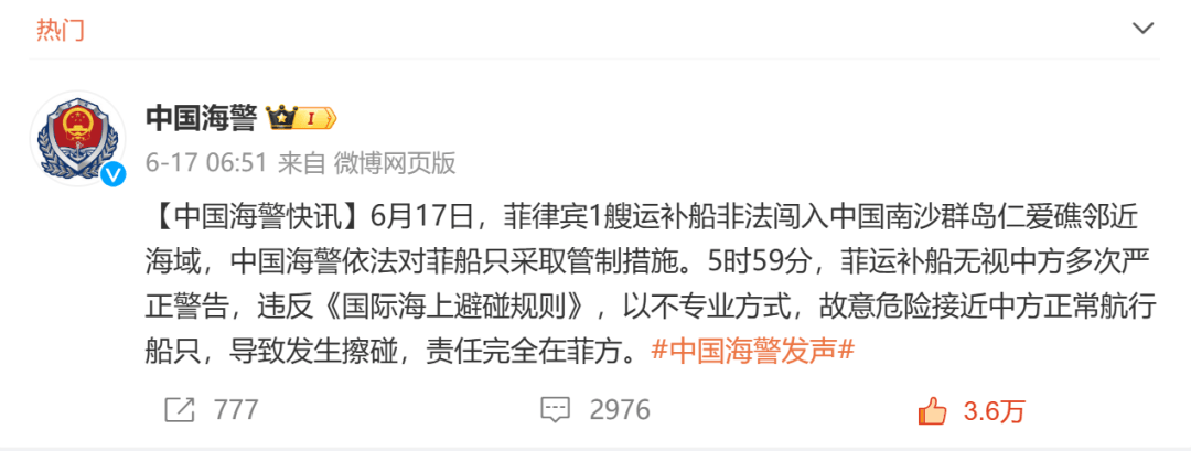 ——6月17日上午06:51分,中國海警官方微博接着説:“菲律賓1艘運補船非法闖入中國南沙羣島仁愛礁鄰近海域,中國海警依法對菲船隻採取管制措施。5時59分,菲運補船無視中方多次嚴正警告,違反《國際海上避碰規則》,以不專業方式,故意危險接近中方正常航行船隻,導致發生擦碰,責任完全在菲方。”